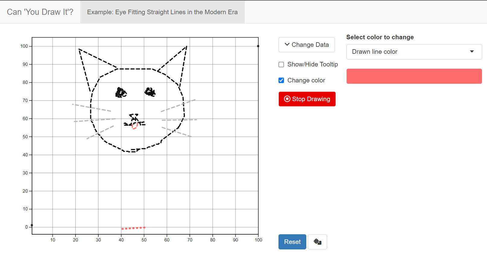 Using the documentation help(drawr) make changes to your graphic such as: changing colors, hiding the true line, or adjusting the start of the drawn line (Hint: look at the example in documentation).